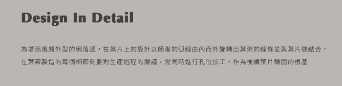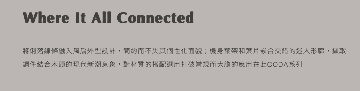 「CODA」一詞源自於拉丁語「Cauda」,原意為「尾巴」,由此啟發設計概念將連接機身的葉架尾端和合板葉片嵌合,進而形成交錯的迷人形廓,賦予風扇外型極簡而低調的設計細節