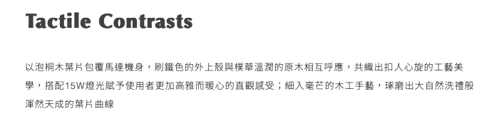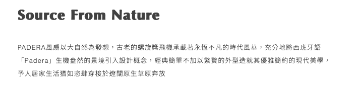 將西班牙語「Padera」生機盎然的景境引入設計概念,予人猶如恣肆穿梭於遼闊原生草原與藍天白雲之間的自由翱翔,琢磨出大自然洗禮般渾然天成的葉片曲線,大幅度提升空氣漩流,更顯著反映在居家節能績效,展現別具一格的生活知性之美