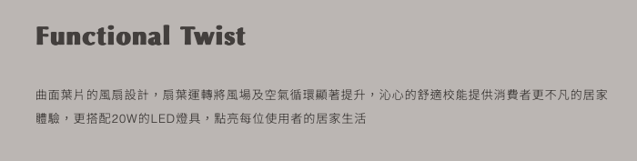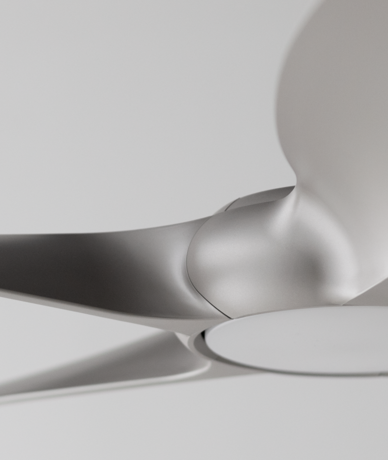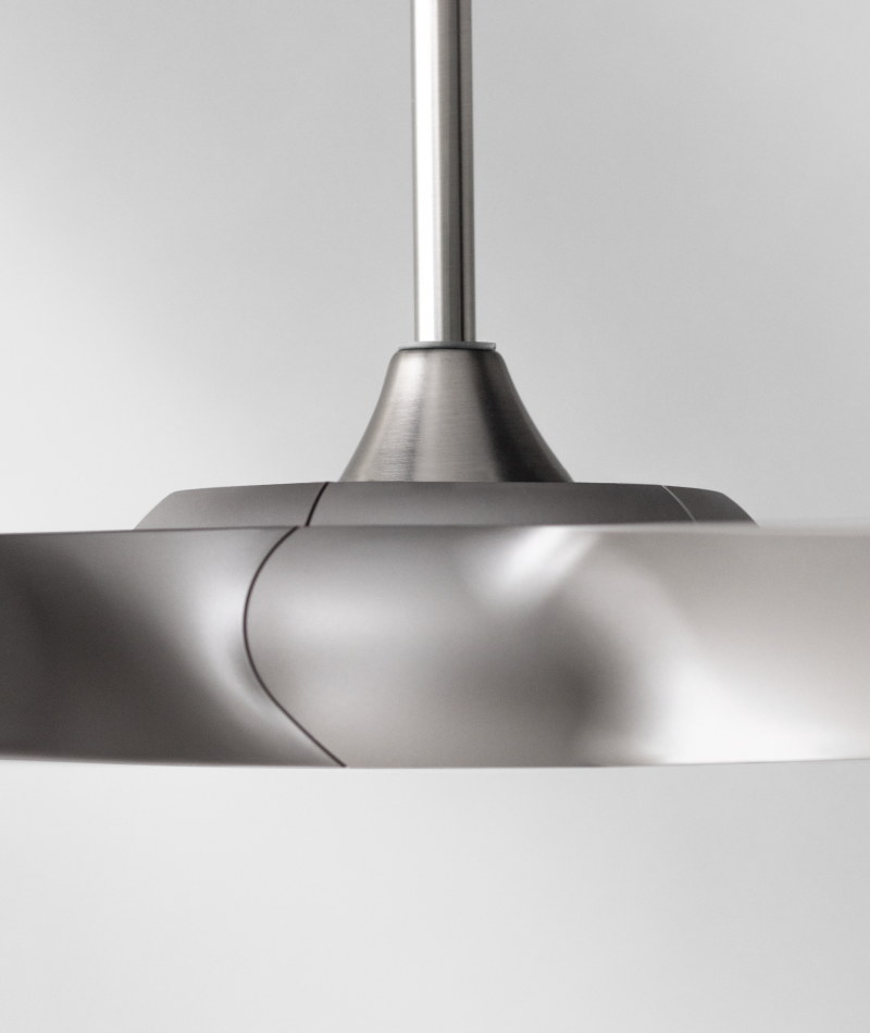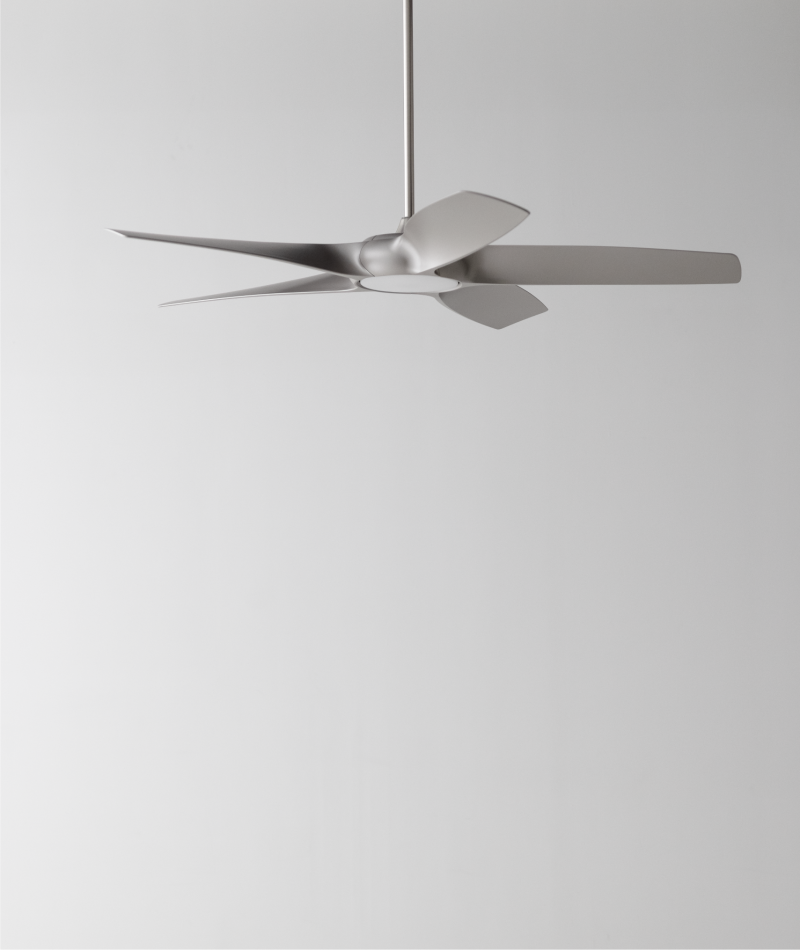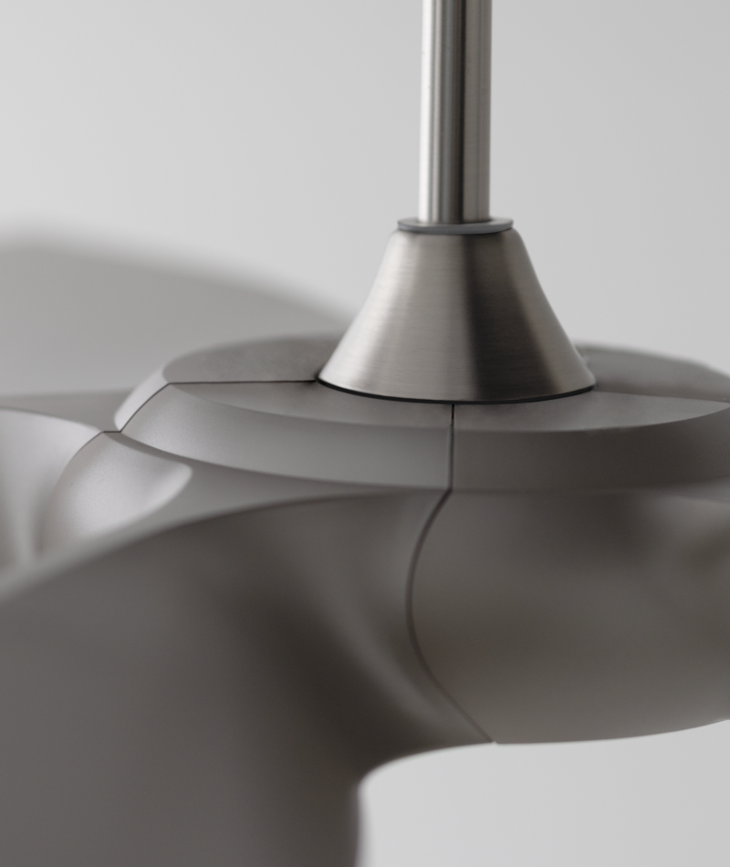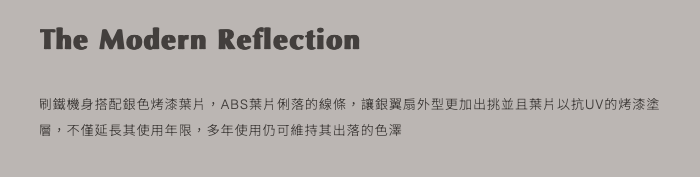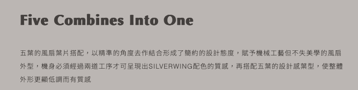 扇葉設計簡潔如銀色刀翼一般、線條俐落極具設計感,五葉的扇葉設計讓整體外型呈現更穩重的表態、更為居家生活增添工業風設計美學