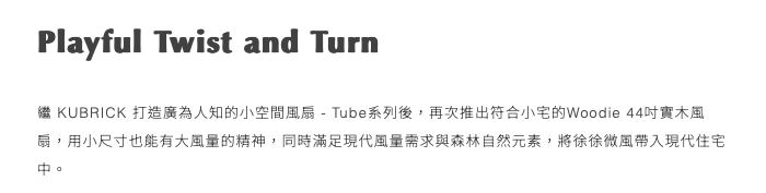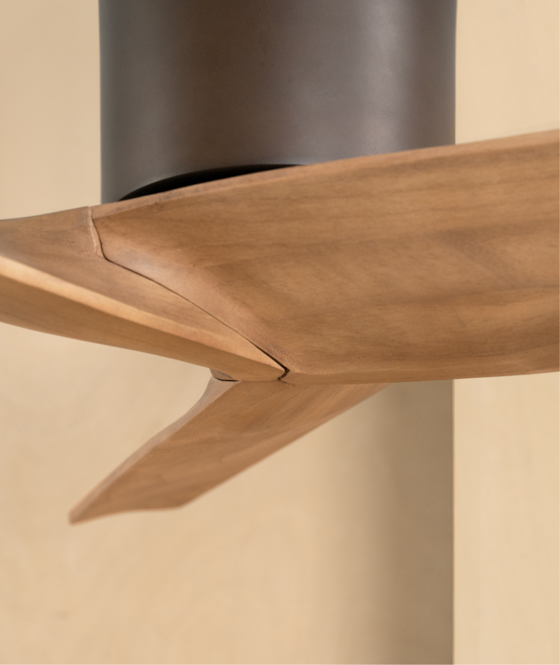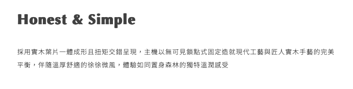 Woodie 44吋風扇延伸經典Tube系列為小宅而生的小尺寸旋徑,結合與自然連接的設計靈感,為其嚴選森林認證實木材質打造扭矩結構,讓洗鍊而輕盈的小巧外型如同樹間風影,靈動而自在地在現代小宅空間中舒適環繞。