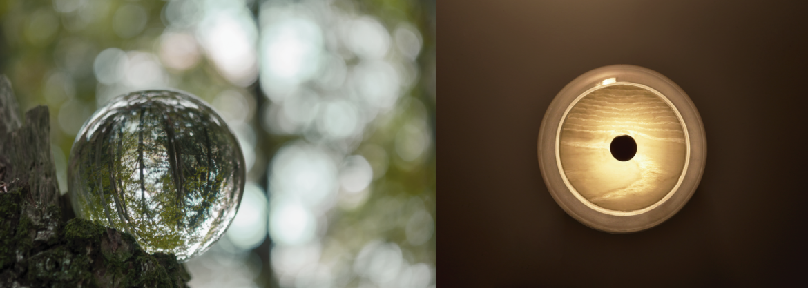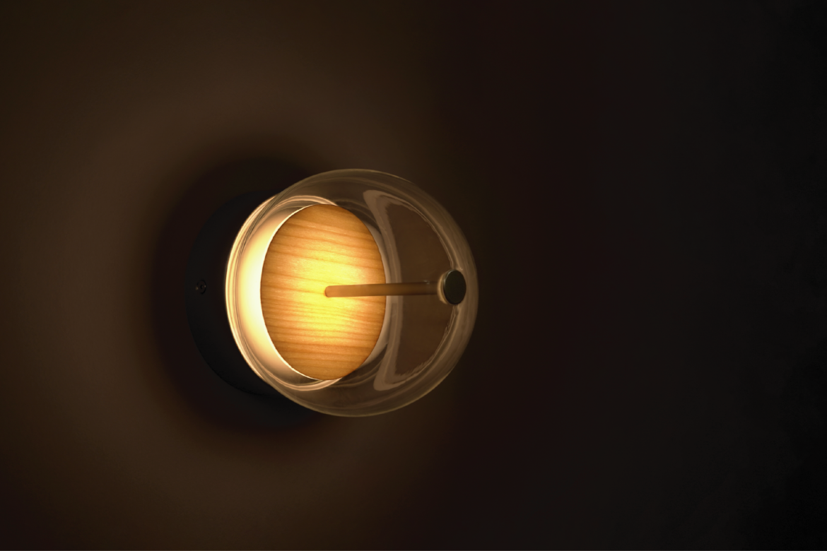 山影多樣的木質紋理呈現自然林間的多樣風貌,結合台灣在地玻璃工藝、天然透光木皮與曲形的出光設計,用一盞燈為家中保留山間一隅的自然印記。