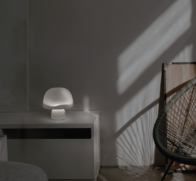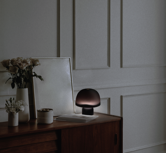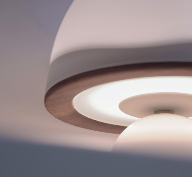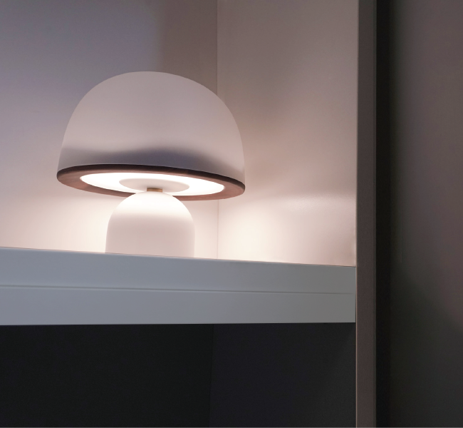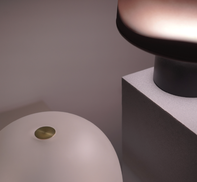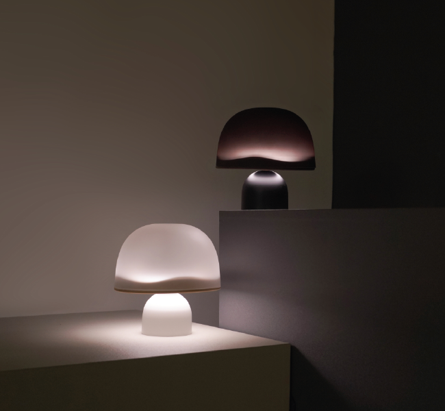 以台灣口吹玻璃工藝製作,透過光學及結構設計出光,使玻璃材質展現晨曦柔和的光與影。玻璃、木頭的異材質搭配如天與地,將晨間寧靜的山陵線轉譯成為淺淺波浪,透過玻璃隱約透出的柔光,呈現美好光景。